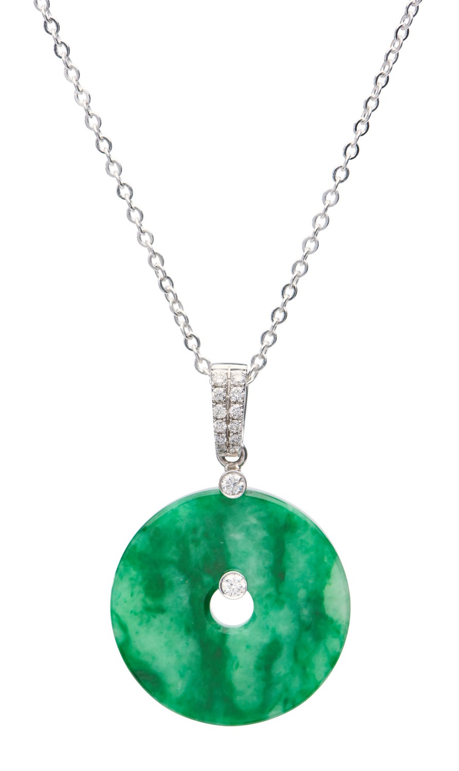 The circular jadeite centrally set with a round brilliant cut diamond, suspended from a diamond set bale, in 18ct white gold, with accompanying HKJSL certificate number M42520 stating Type A jade.