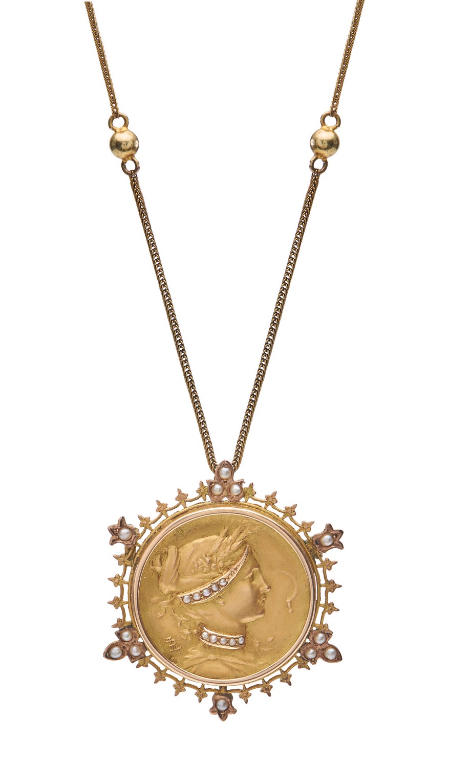 The finely detailed medallion featuring a woman in profile within a decorative border set with seed pearls, with glazed photo locket to the reverse, in 9ct gold, suspended on a fine fox link chain, in 15ct gold.