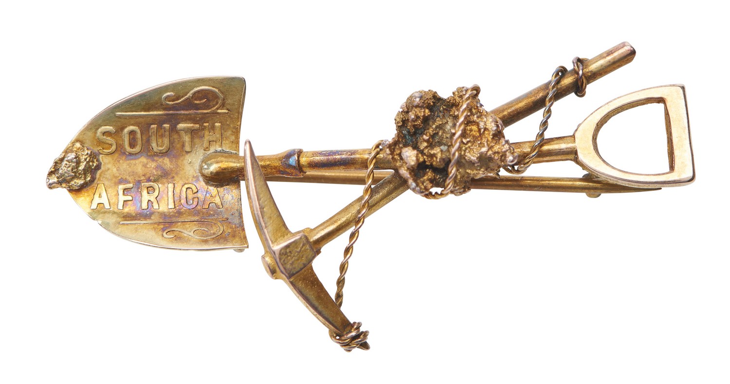 The finely detailed shovel, pick and nugget, in 9ct gold, boxed.
