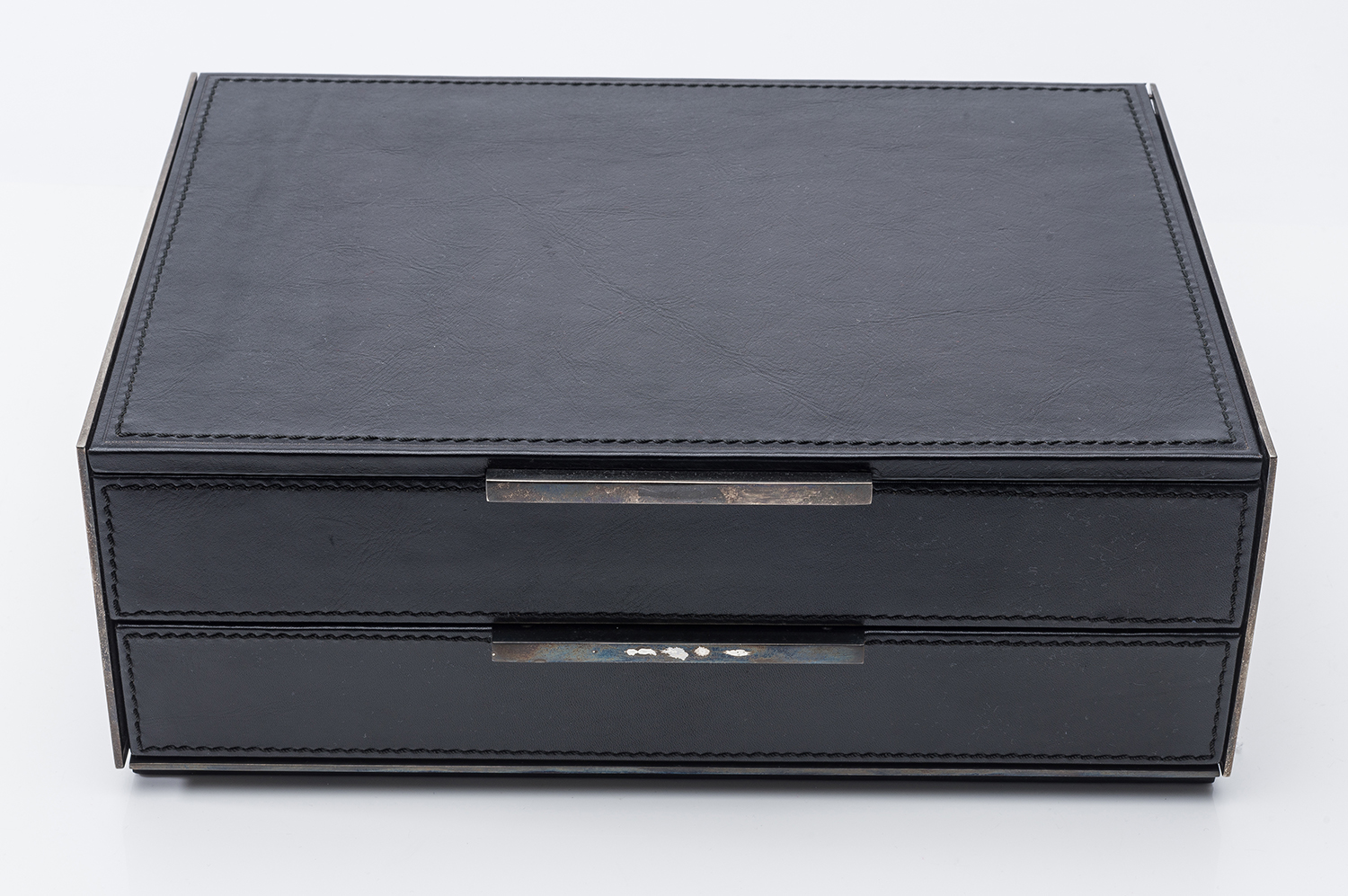 Styled in black leather and patina metal, 32 x 21 x 12cm.