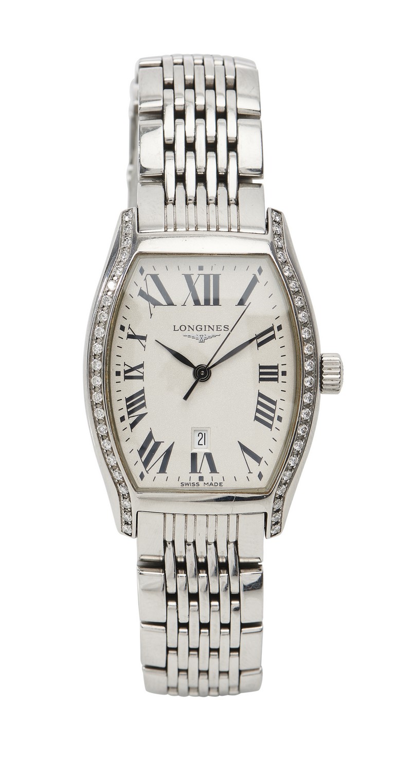 Quartz movement, tonneau shaped white dial with black Roman numerals, date aperture at six, signed case, dial and movement, stainless steel case with diamond set bezel, stainless steel bracelet bands, total length 175mm, case 30mm x 25mm, with papers.