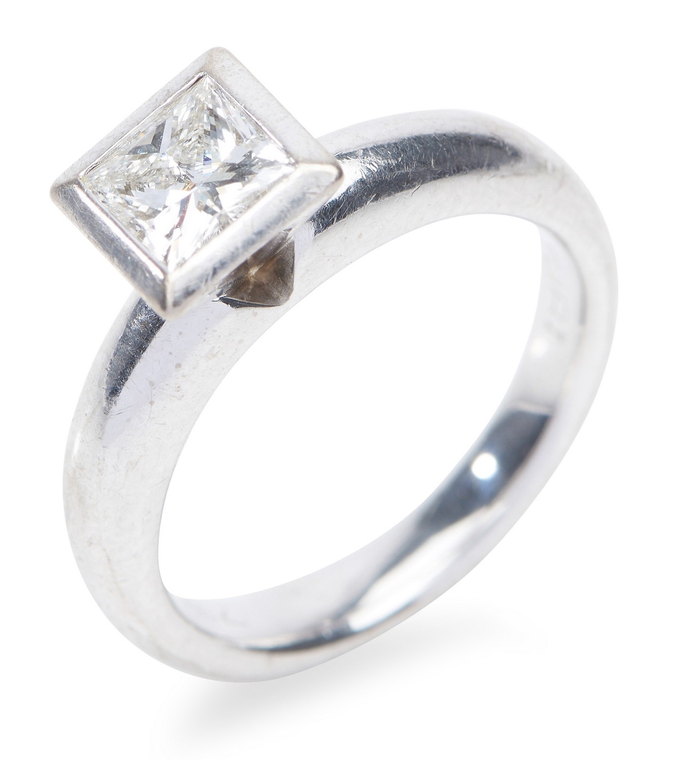 The princess cut diamond weighing 0.82cts, bezel set in 18ct white gold, ring size L 1/2.