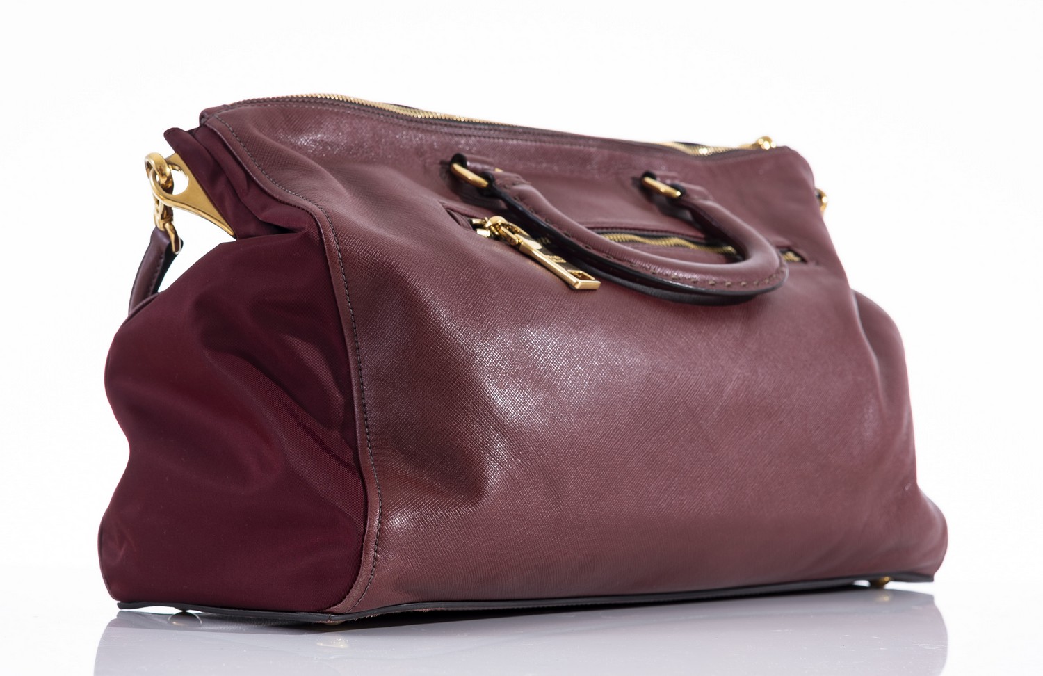 Styled in burgundy leather and nylon with gold metal hardware, 27 x 39 x 14cm.