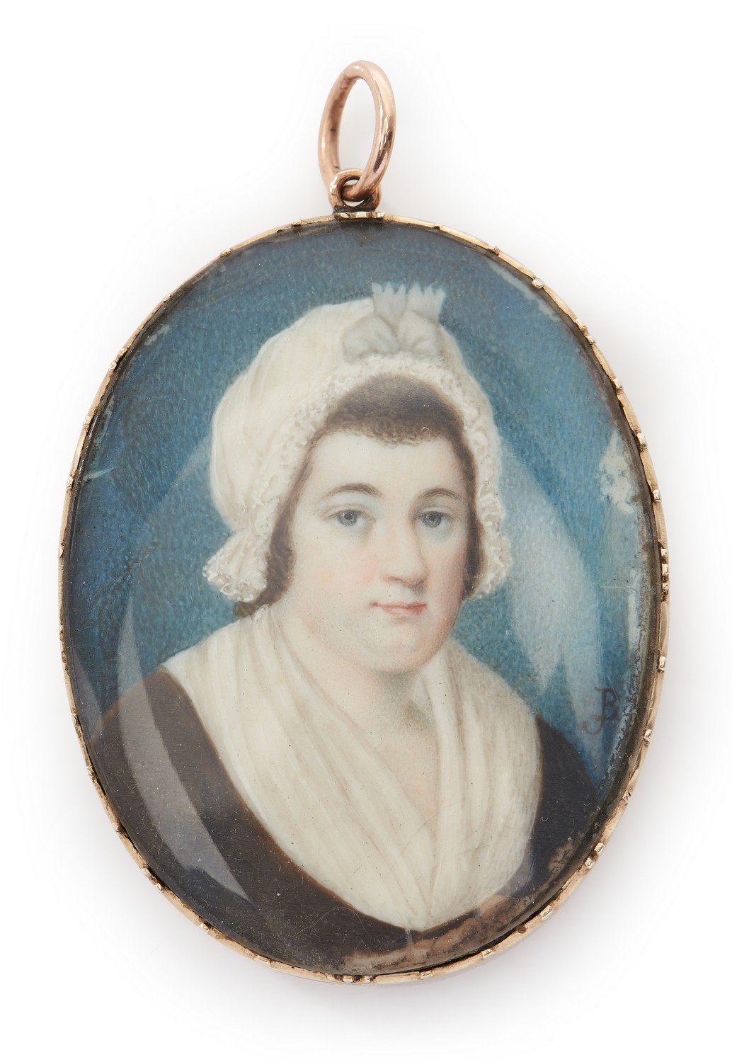 The oval hand painted and glazed portrait within a decorative frame, engraved to the reverse, "Hannah Larkin, 1790 at 42", in 9ct gold, in original fitted oval box.