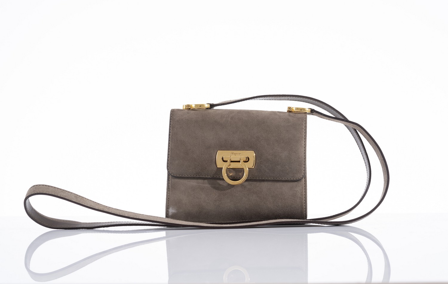 Styled in taupe suede with golden metal hardware, 12 x 16 x 6cm.