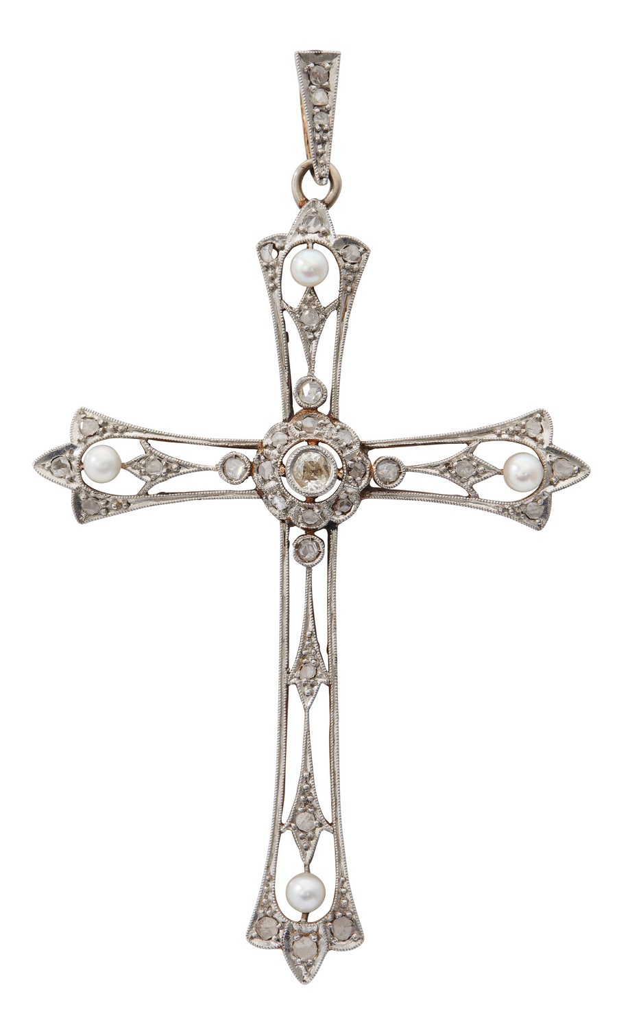 The pierced cross featuring a central diamond cluster with fine diamond detail and pearl set terminals, in 18ct gold and platinum, circa 1900.