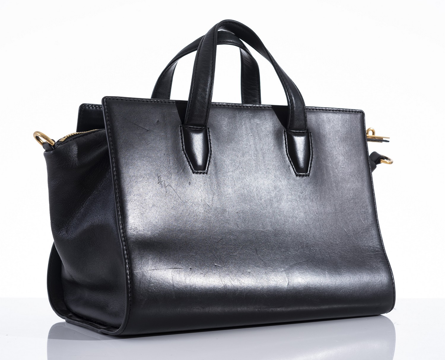 Styled in black leather with gold metal hardware and detachable long strap, 22 x 33 x 20cm.