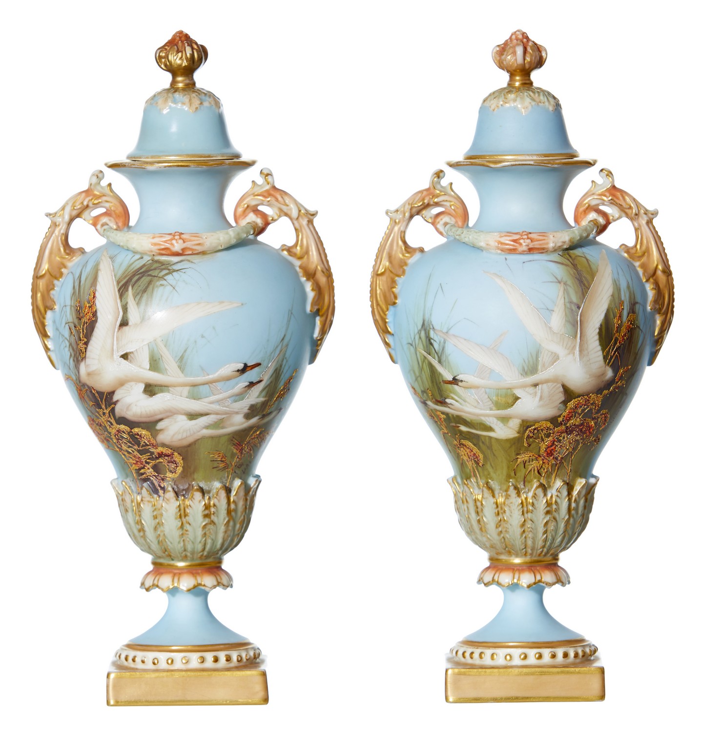The mirrored pair baluster in form, depicting swans in flight on a powder blue ground, flanked by foliate handles. Green Royal Worcester backstrap and date code 1900, shape 1937.
