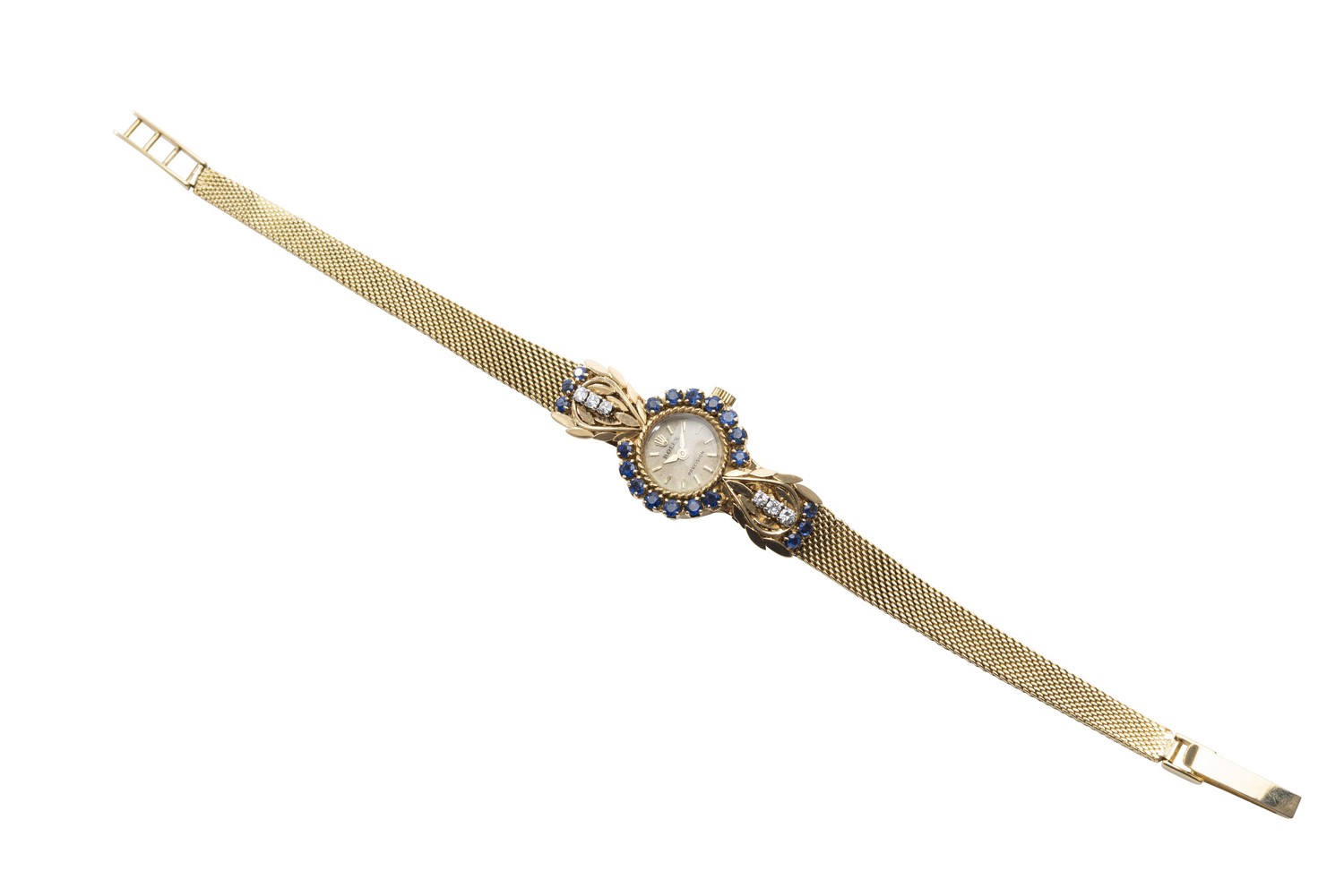 Manual wind movement, circular cream dial with gold baton numerals, signed case, dial and movement, sapphire bezel, with sapphire and diamond set lugs, 18ct gold case to fine mesh bracelet bands, diameter 10mm, total length 170mm.