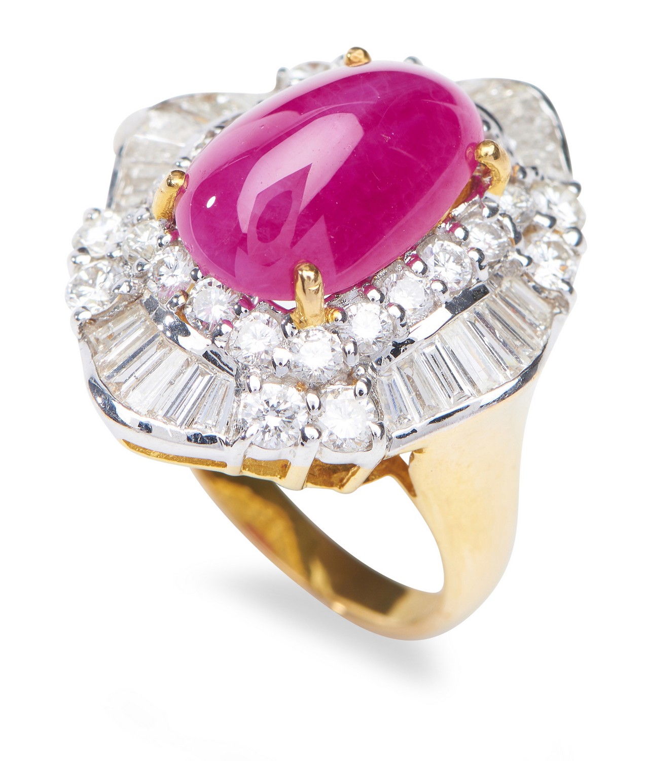 Of cluster design, centrally set with an oval ruby cut en cabochon, within a surround of round brilliant and baguette cut diamonds, in 18ct gold, ring size M.