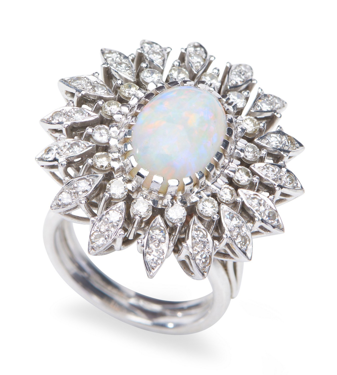 Overall condition of ring is very good. All stones secure in their settings. Opal displays a good play-of-colour in orange, yellow, green, violet and flashes of red. Approximate colour G-I and clarity VS-P1.