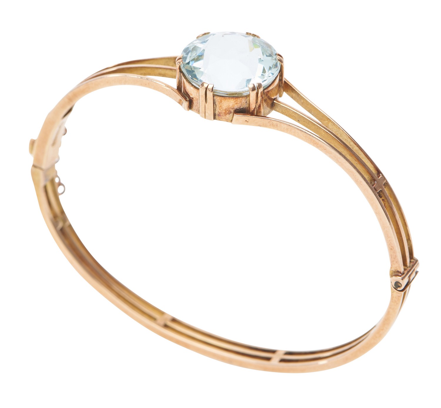 The hinged bangle centred with an aquamarine weighing 10.67cts, to an open triple bar, in 15ct gold, hallmarked 'W.15.D.' , Drummond & Co, Melbourne.