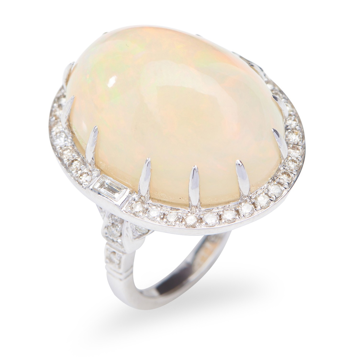 Of cluster design, the oval opal cut en cabochon weighing 30.0cts, surrounded and shouldered by round brilliant and baguette cut diamonds totalling 0.70cts, in 18ct white gold, ring size N.