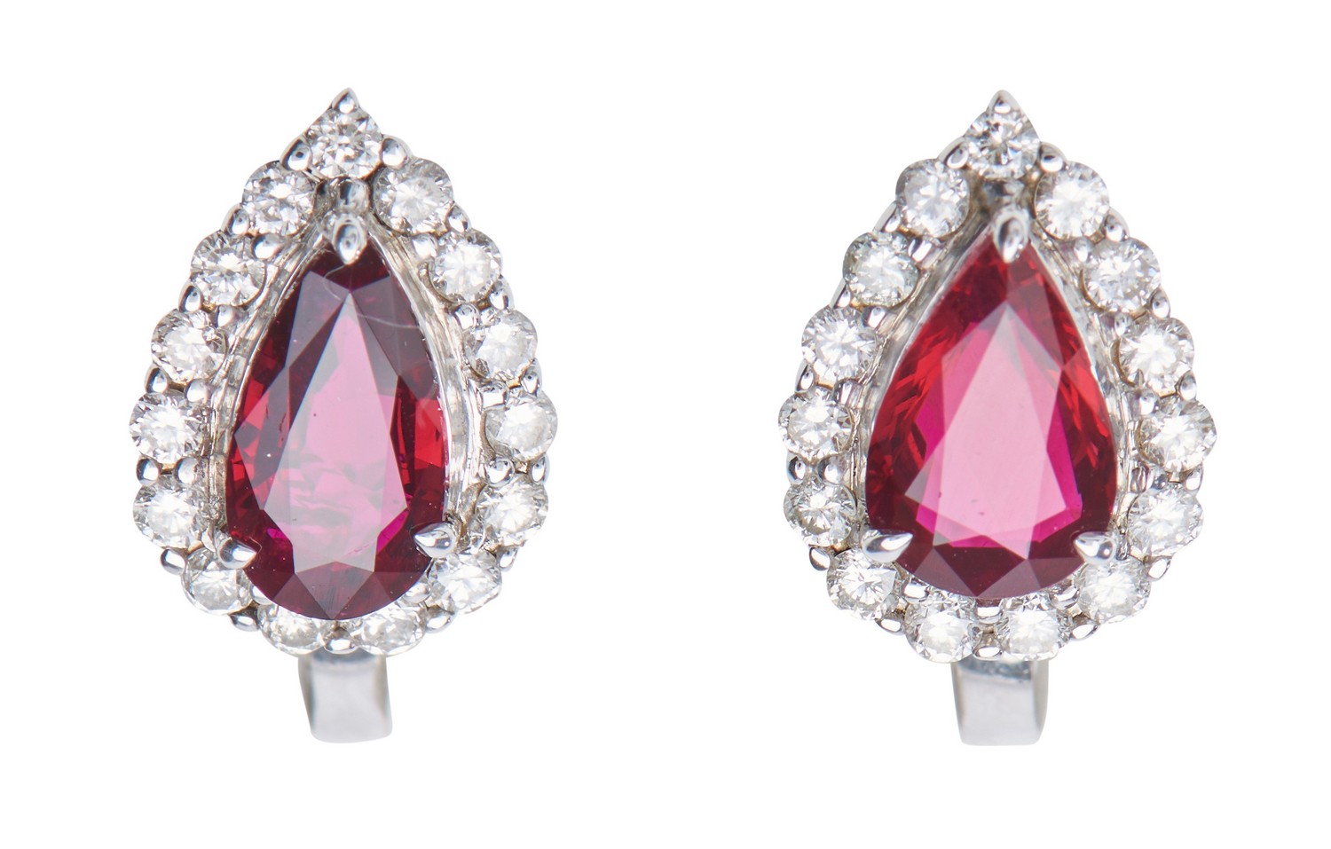 Each earring set with a pear cut ruby weighing an estimated 0.95cts, surrounded by round brilliant cut diamonds, in 18ct white gold.