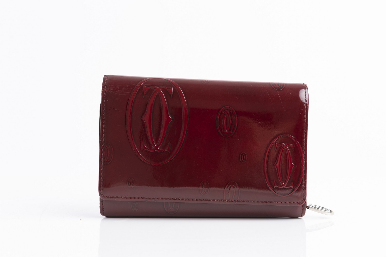Styled in burgundy monogram patent leather with silver metal hardware, 10 x 14.5cm.