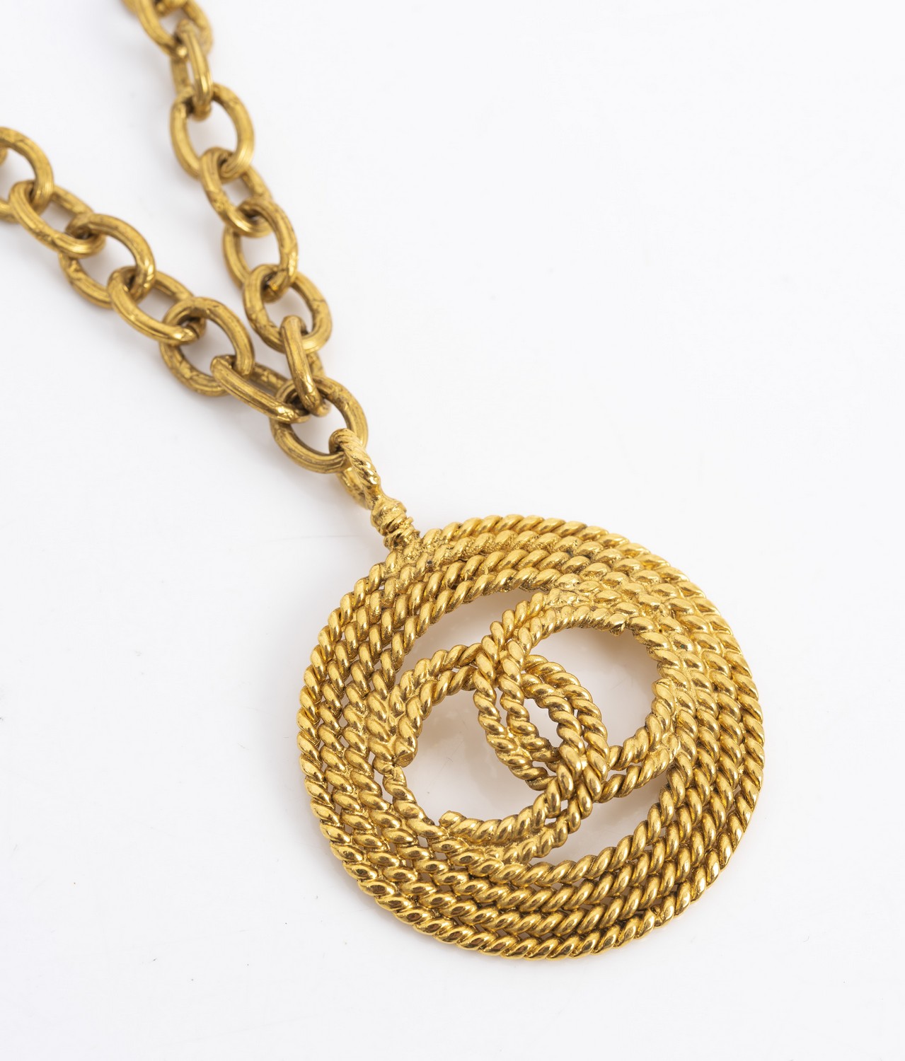 Styled as circular pendant with 'CC' motif, in gold metal, boxed.