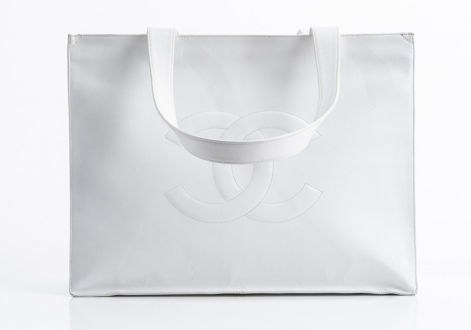 Styled in white Caviar leather with stitched 'CC' motif, 31 x 42 x 11cm.