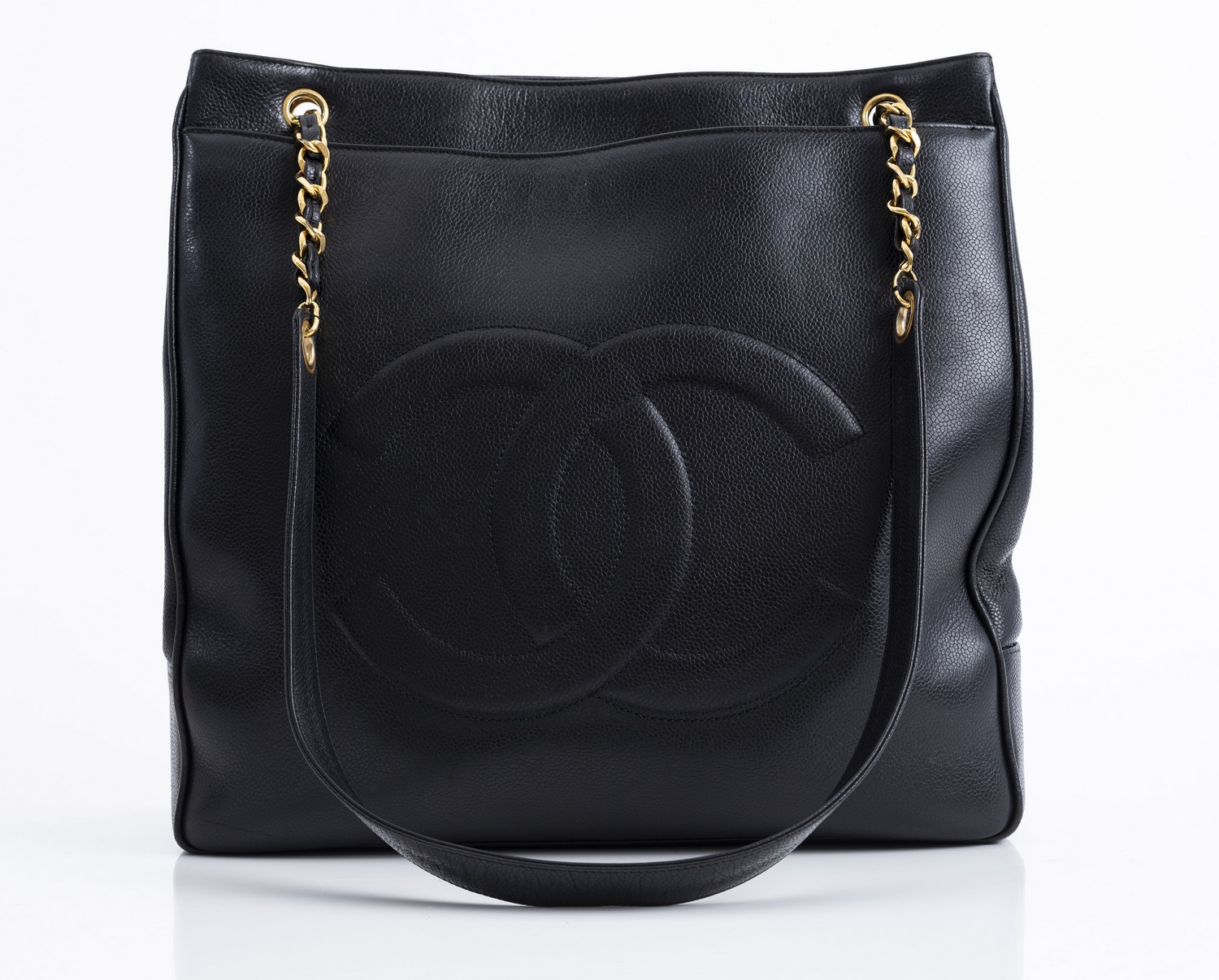 Styled in black Caviar leather with gold metal hardware and chain weave strap, 35 x 35 x 10cm.