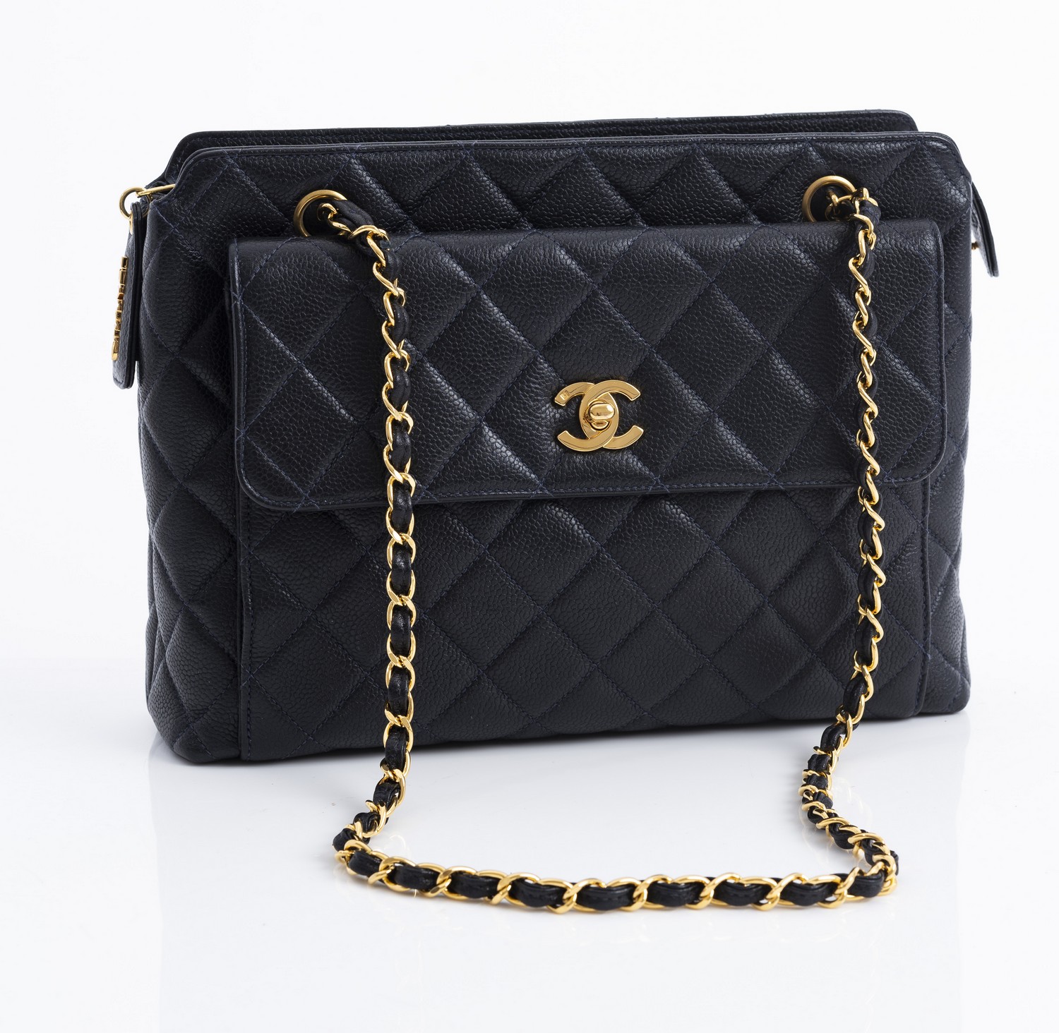 Styled in Caviar quilted leather with gold metal hardware and chain weave strap, 20 x 28 x 8cm.