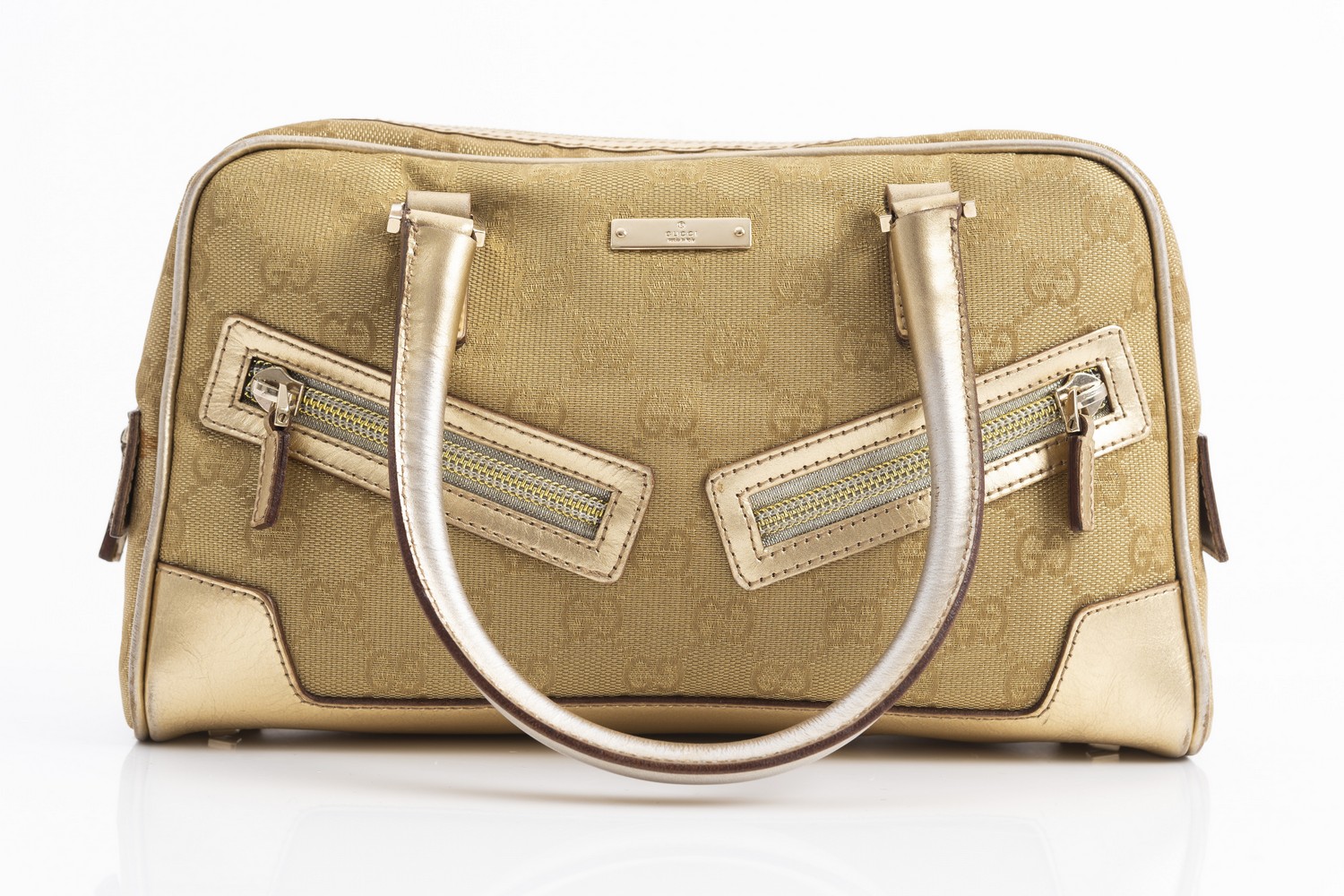 Styled in gold monogram canvas and leather with gold metal hardware, 15 x 25 x 7cm.