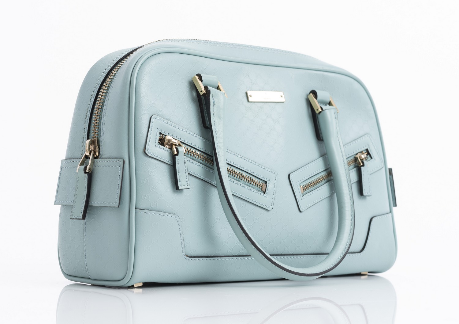 Styled in pale blue micro Guccissima leather with gold metal hardware, 15 x 25 x 8cm.