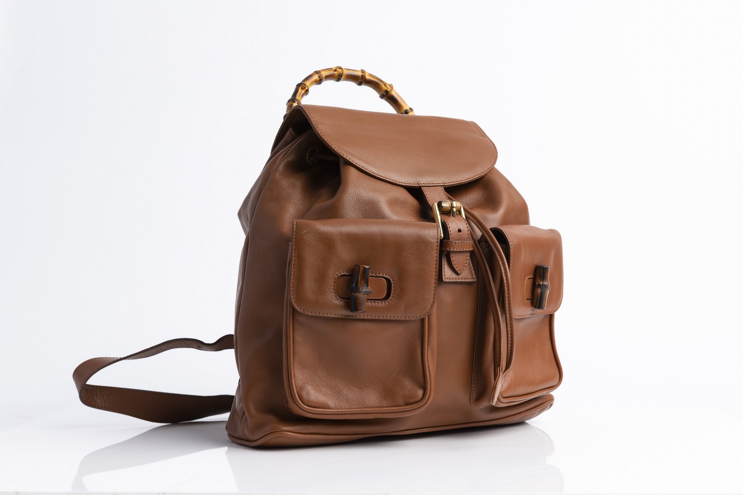 Styled in brown leather with bamboo and gold metal hardware, 32 x 30 x 10cm.