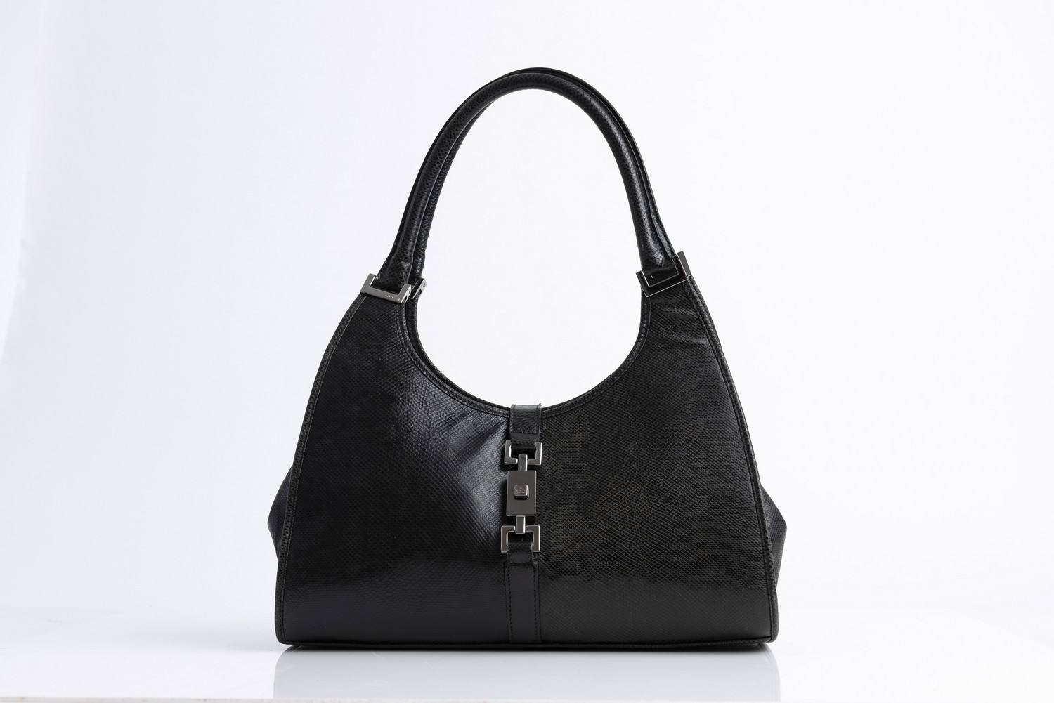 Styled in black lizard embossed leather with silver metal hardware, 28 x 31 x 8cm.