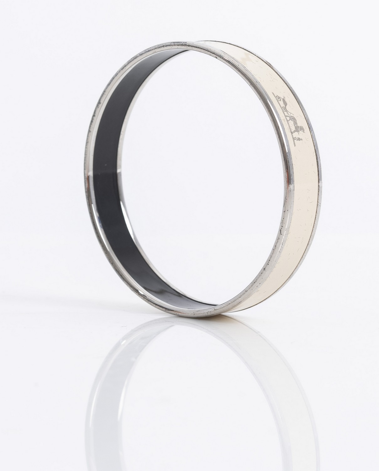 Styled in white enamel with horse and carraige design and silver metal, boxed.