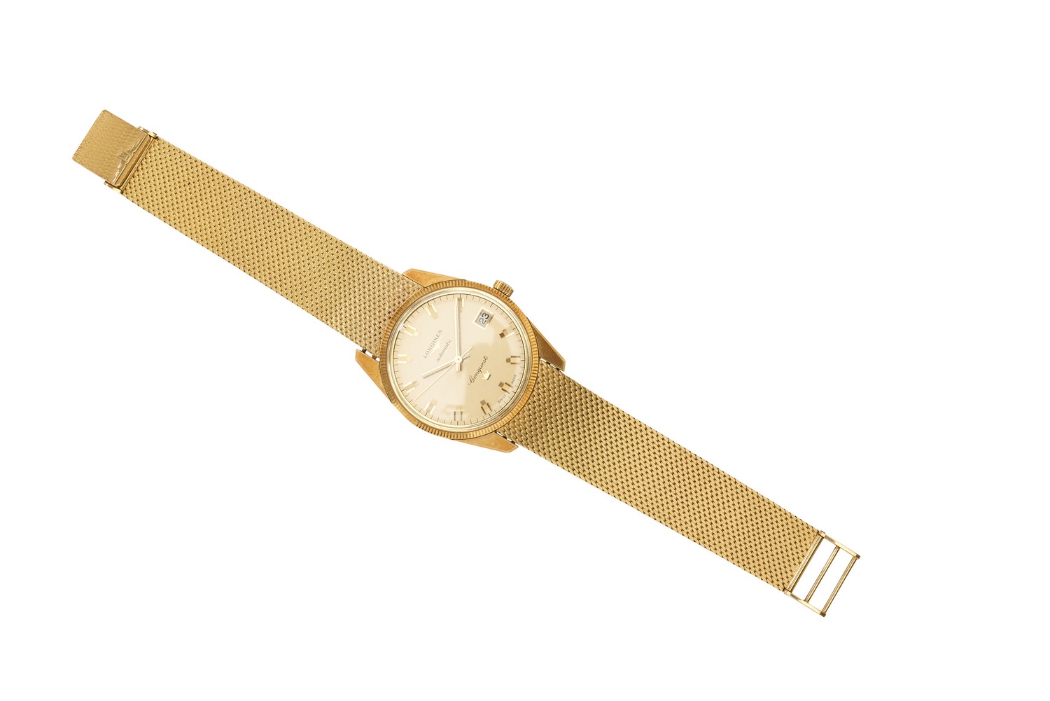 Automatic movement, circular gilded dial with gold batons, date aperture at three, signed case, dial, movement and bands, 18ct gold case with conforming woven bracelet bands, total length 185mm, diameter 35mm, boxed.