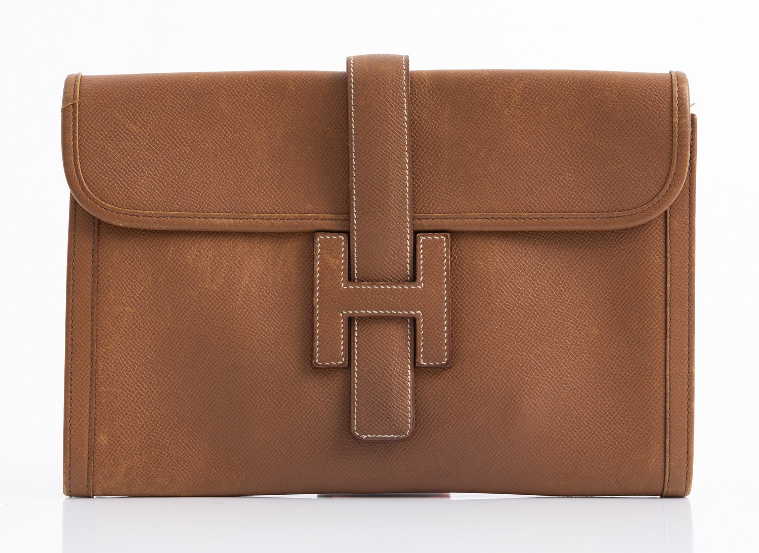 Styled in beige grained leather with contrast white stitching, 20 x 29cm.