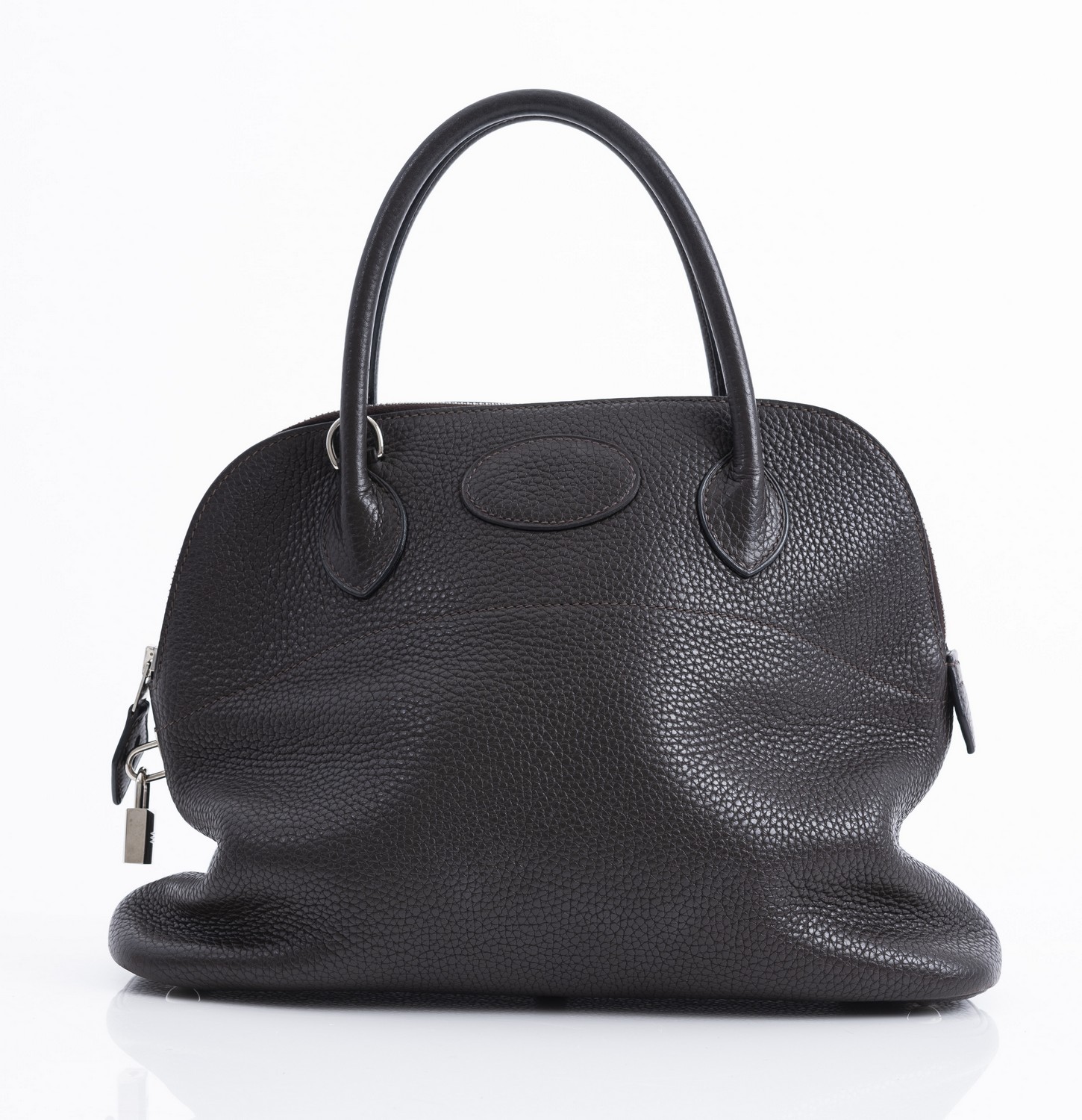 Styled in chocolate Clemence leather with palladium metal hardware, 24 x 31 x 15cm.