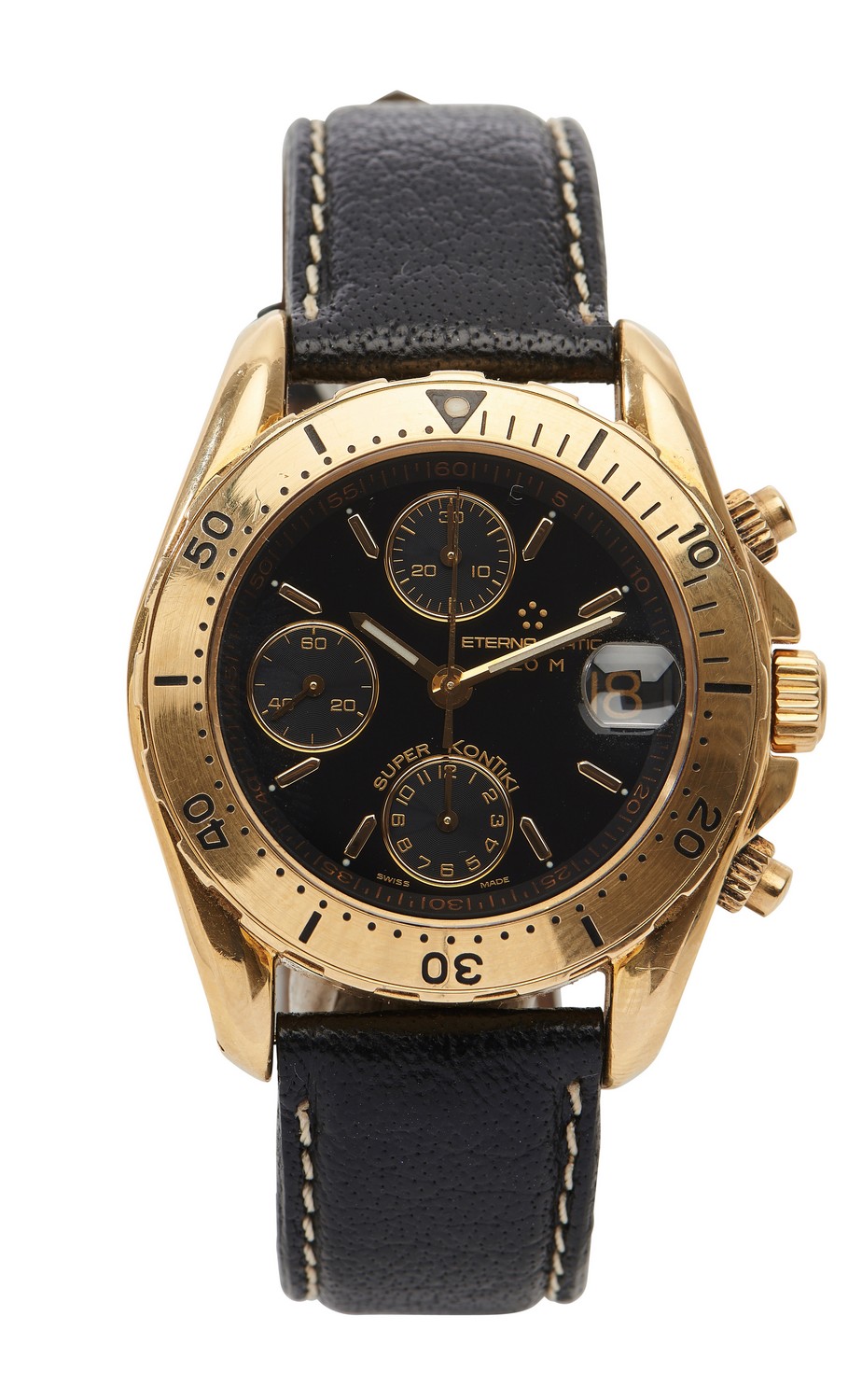 Automatic movement, circular black dial with gold batons, subsidiary dials at six, nine and twelve, date aperture at three, signed case, dial, movement and clasp, 18ct gold case with rotating bezel, black leather bands with 18ct gold deployment clasp, diameter 40mm.