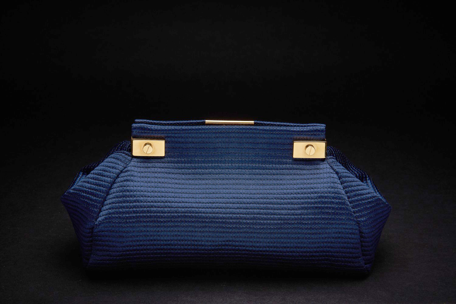 Styled in navy fabric with gold metal hardware, 16 x 28 x 13cm.