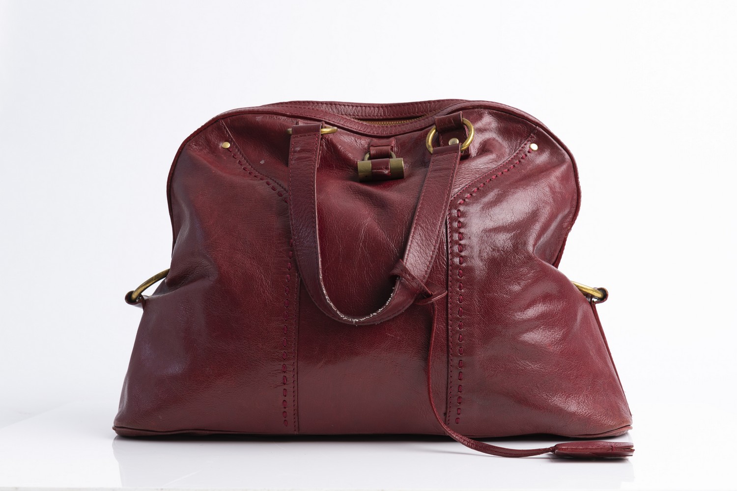 Styled in red leather with gold metal hardware, 32 x 42 x 15cm.