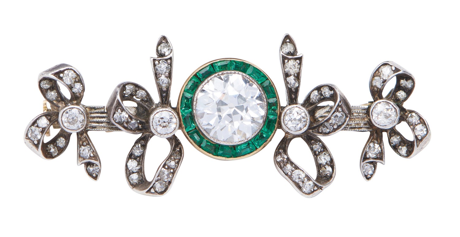 Centred with an old European cut diamond weighing 1.22cts, within a fine border of calibre cut emeralds, flanked by diamond set bow motifs, in 15ct gold and silver.
