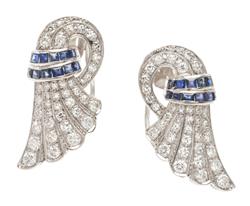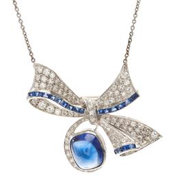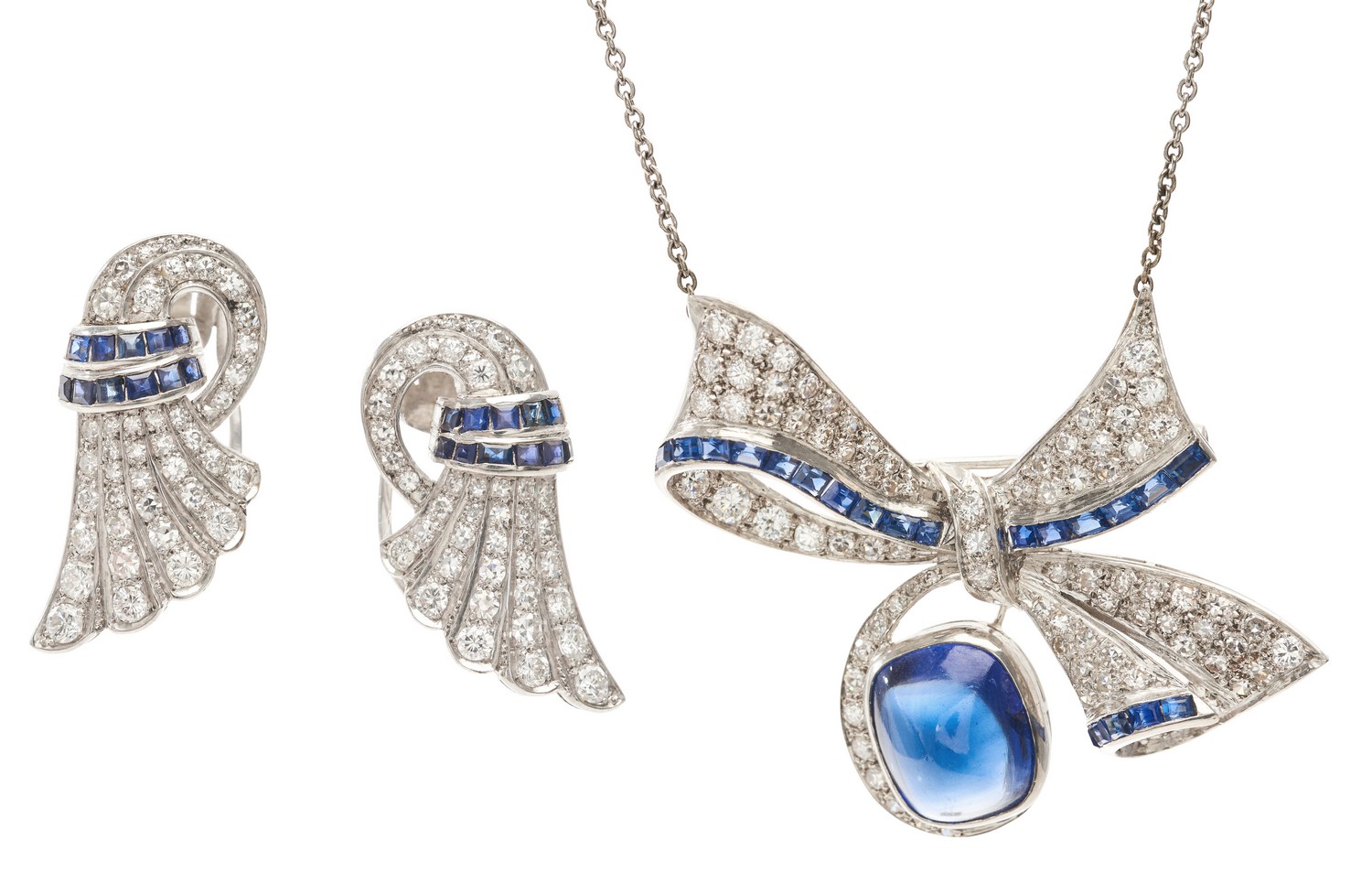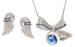 Comprising a pendant of stylised bow design set with a synthetic sapphire cut en cabochon, with single cut diamond and sapphire detail, together with a pair of sapphire and diamond earrings to clip fittings, in platinum.