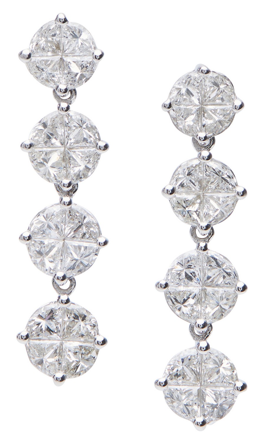 Each earring comprising four clusters of invisibly set diamonds, altogether totalling 2.76cts, in 18ct white gold.