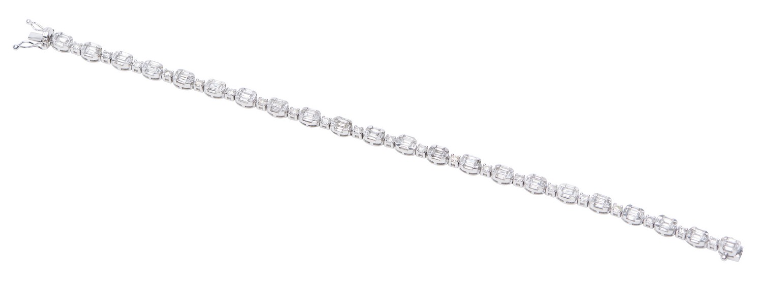 Comprising twenty two cushion shaped clusters of baguette cut diamonds spaced by round brilliant cut diamonds, altogether totalling 4.22cts, in 18ct white gold, total length 180mm.
