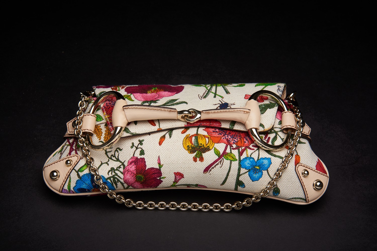 Styled in flora and fauna canvas with tan leather and gold metal horsebit detail with gold metal chain, 12 x 28 x 2cm.
