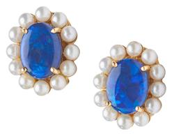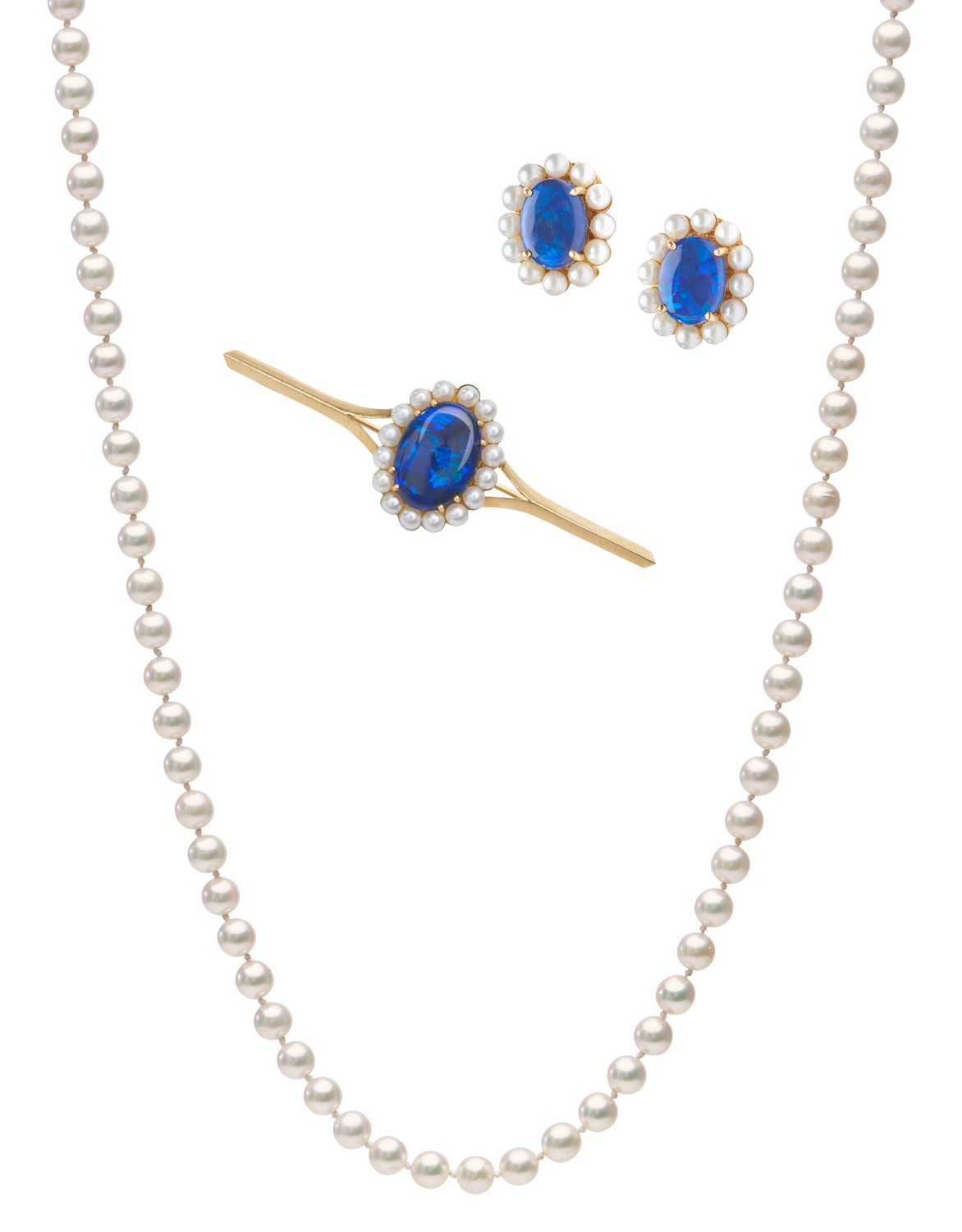 Comprising a matinee length strand of pearls of cream and pink hues, measuring 7.2mm to 7.5mm, to an opal and pearl set clasp, together with a conforming brooch and pair of earrings to clip fittings, all in 18ct gold.