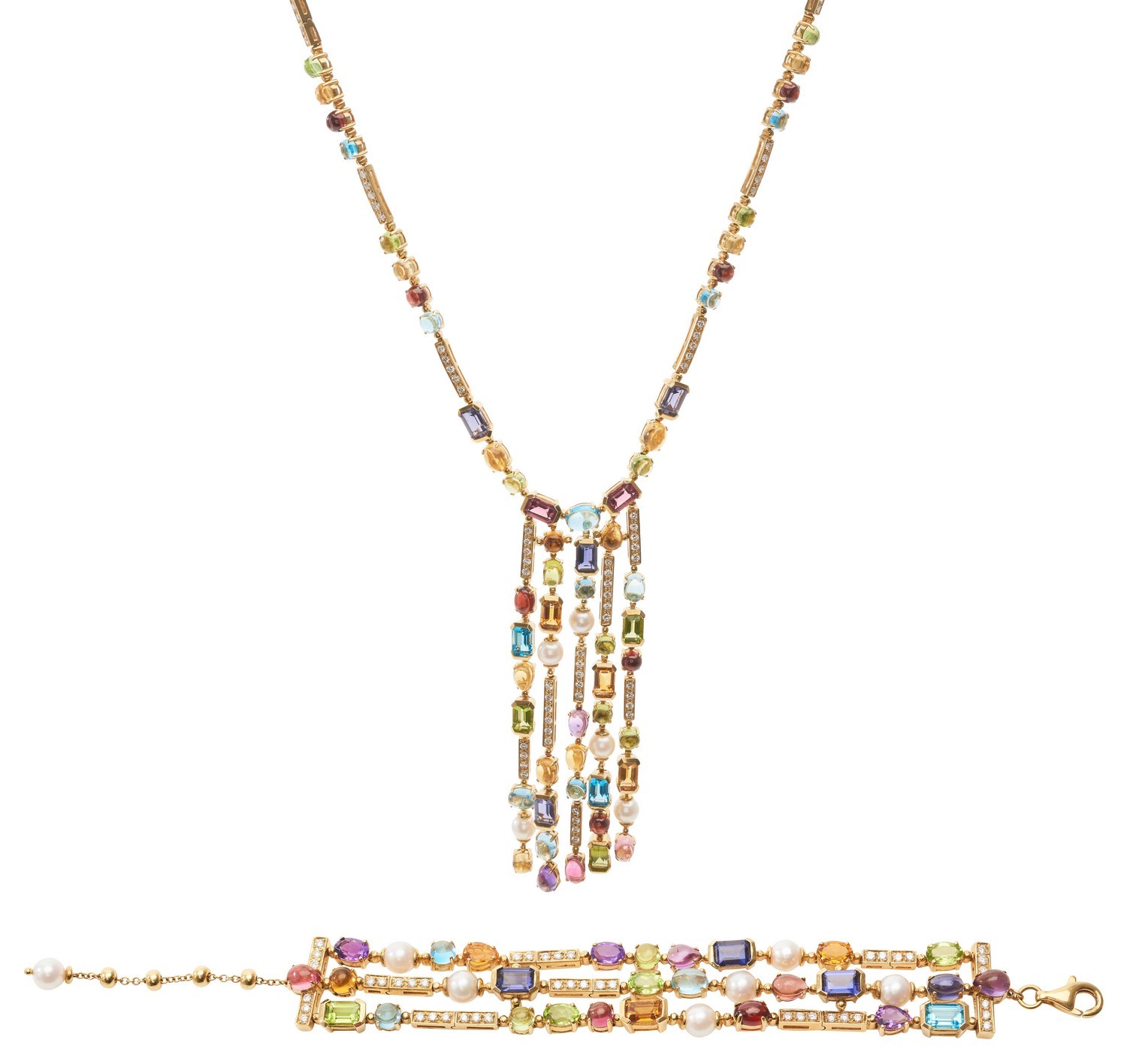 The fringed necklace comprising multi-coloured gems of varying cuts, including peridot, garnet, tourmaline, topaz, cultured pearls, tanzanite, citrine and amethyst spaced by diamond set bars, together with a conforming triple row bracelet, in 18ct gold.