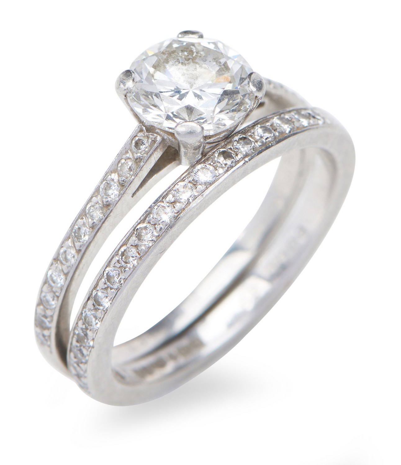 The rings present in good condition overall. The diamonds are all in good order and securely set. Platinum surfaces show some evidence of wear. Colour G and clarity VS2.