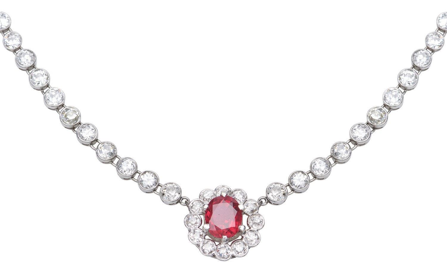 Featuring a ruby weighing an estimated 1.10cts, within a cluster of old European cut diamonds, centred on a diamond riviere, in 18ct white gold, total length 395mm.
