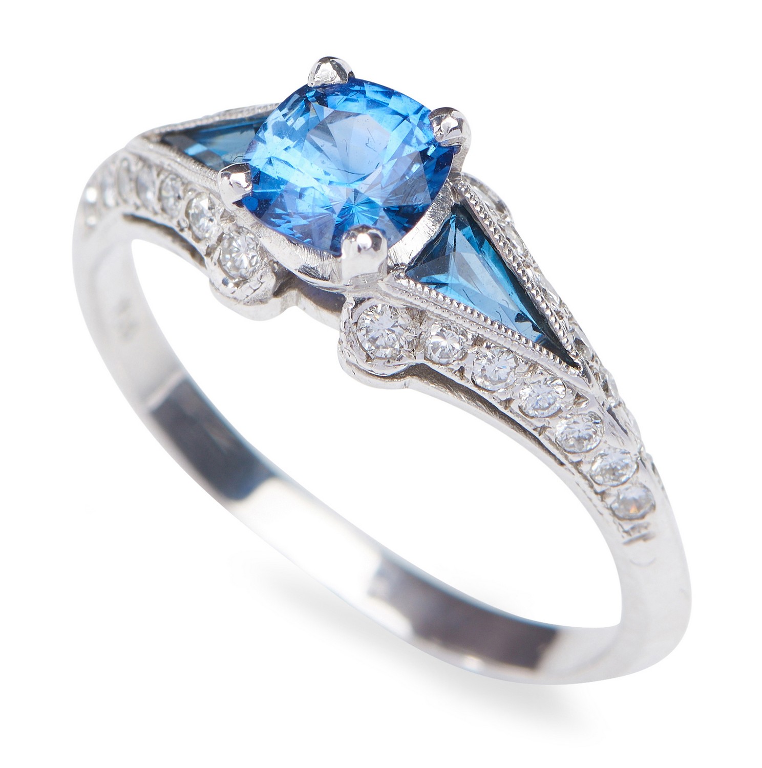 Of Art Deco style, featuring a central sapphire flanked by trilliant cut sapphires, with fine diamond borders and underbezel, in 18ct white gold, ring size P 1/2.