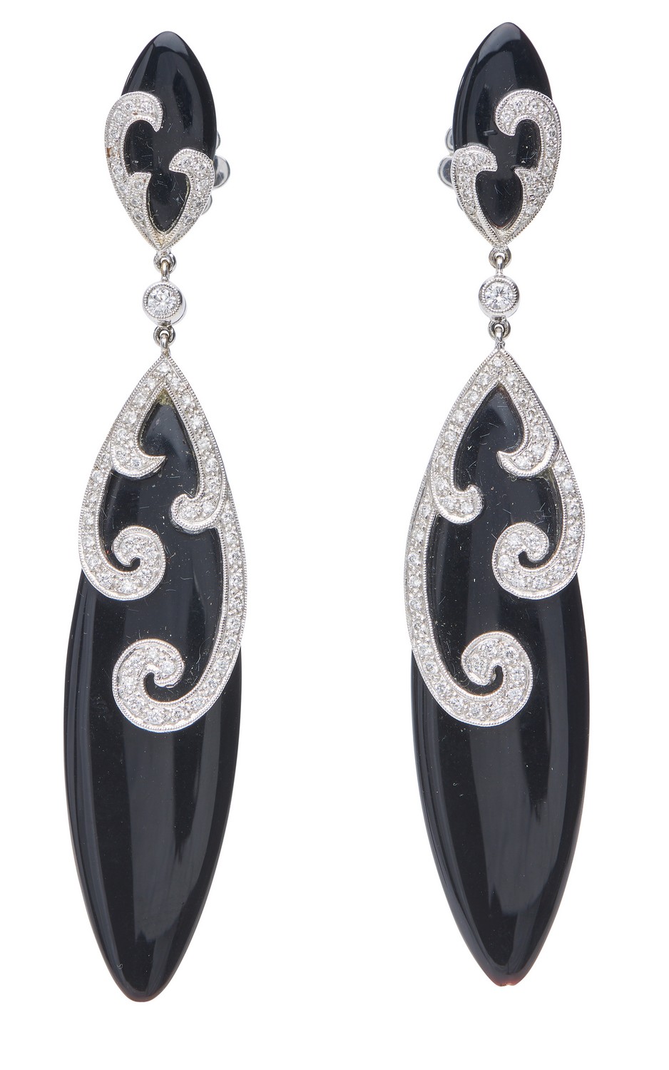 Of Art Deco style, each earring comprising a navette shaped onyx drop with scrolled diamond set detail, to a conforming stud fitting, in 18ct white gold.