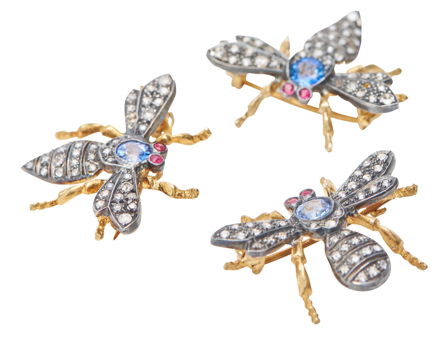 The finely detailed insects with rose cut diamond set wings and bodies, with sapphire and ruby detail, in 9ct gold and silver.