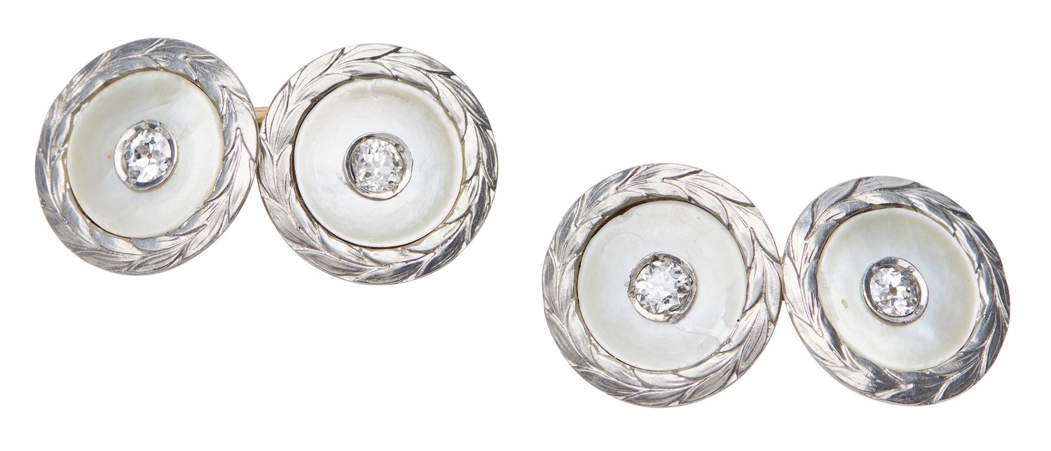 The cufflinks present in very good overall condition. Minor wear to gold surfaces. There is very minor damage to the edge of one mother of pearl plaque. Diamonds are all secure in their settings.