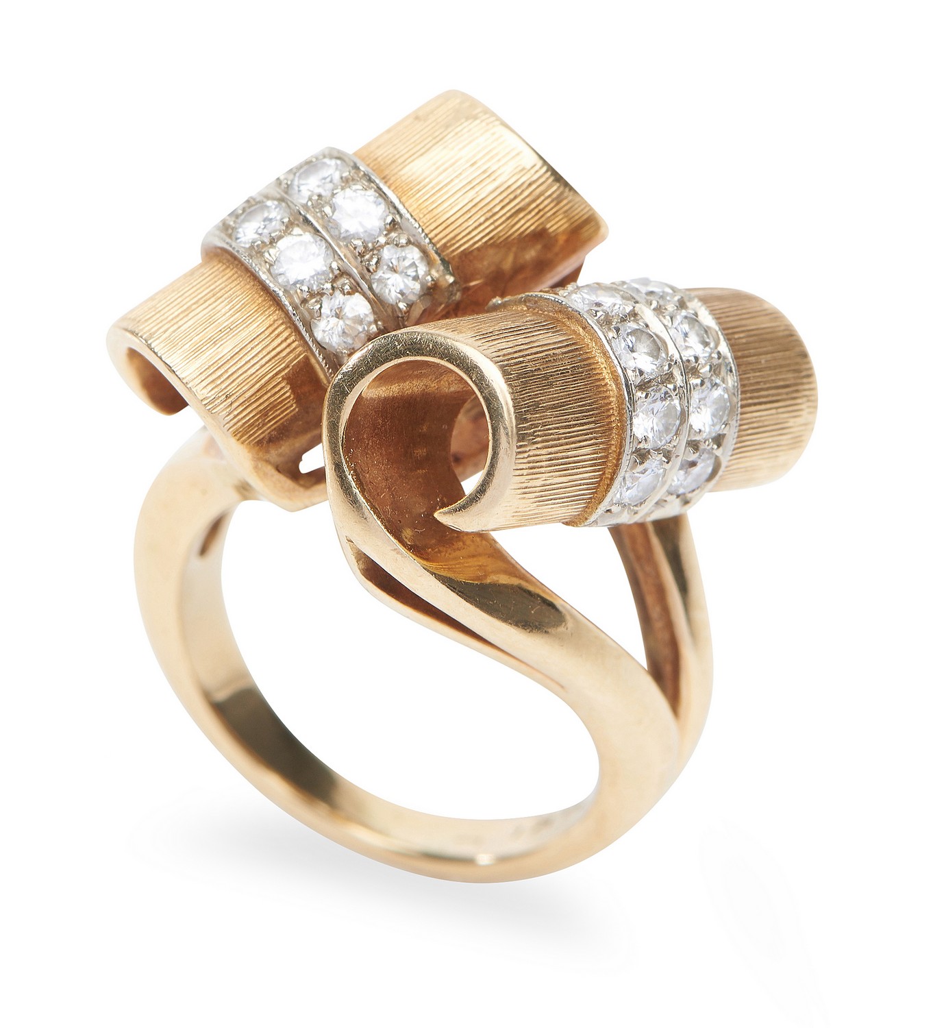 Of Retro design, comprising dual scrolls, each with central diamond detail, in 14ct gold, ring size H.