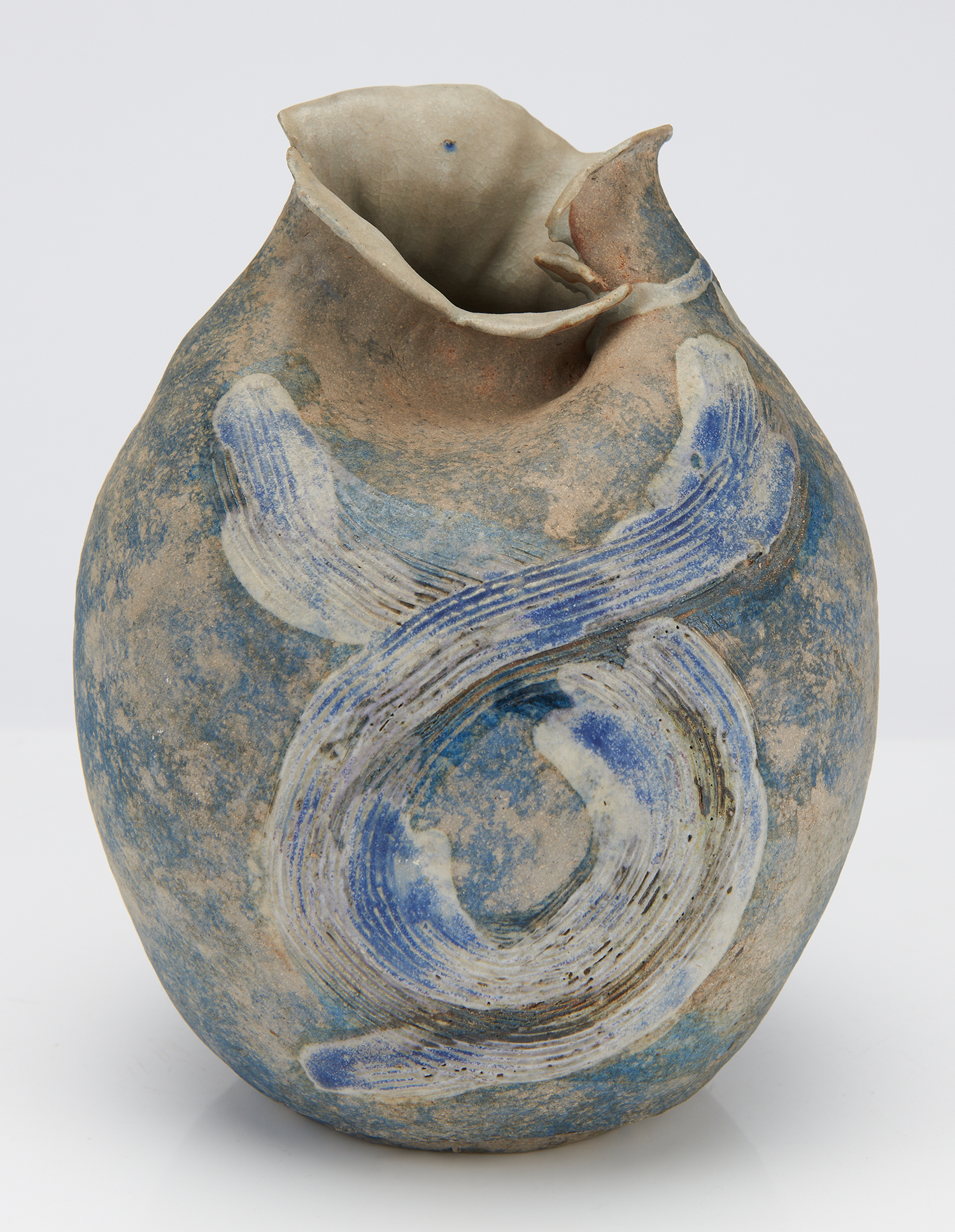 A SYLVIA HALPERN VASE, BLUE WITH SCRAFFITO MOTIF - 20.8 CM HIGH