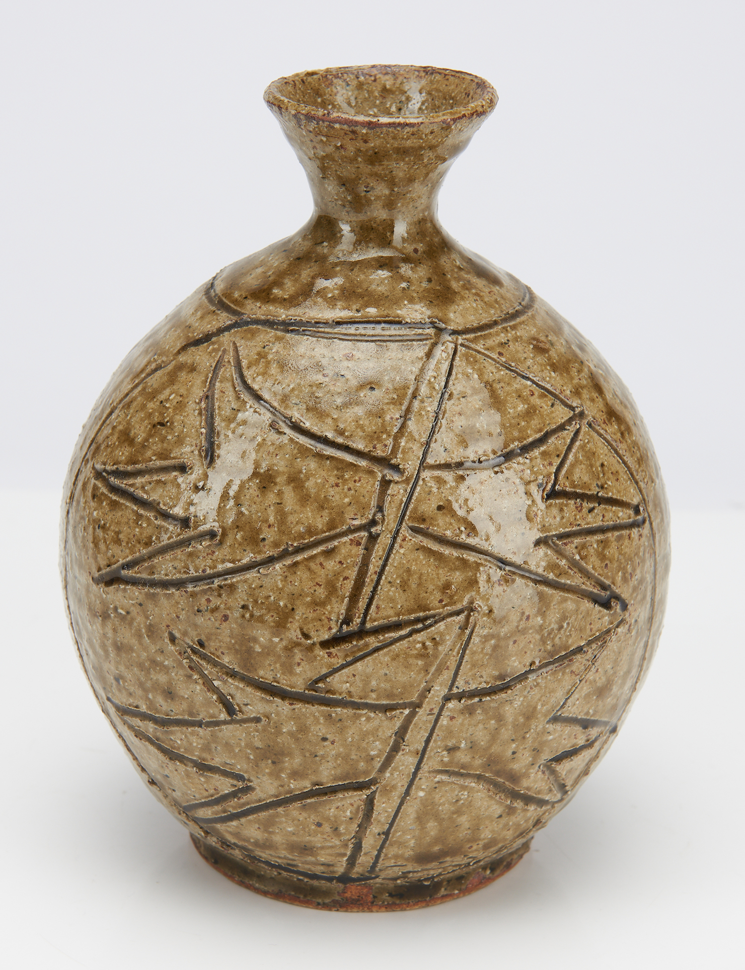 A GREEN GLAZED EARTHENWARE VASE WITH SCRAFFITO TREE DECORATION - 18.9 CM HIGH